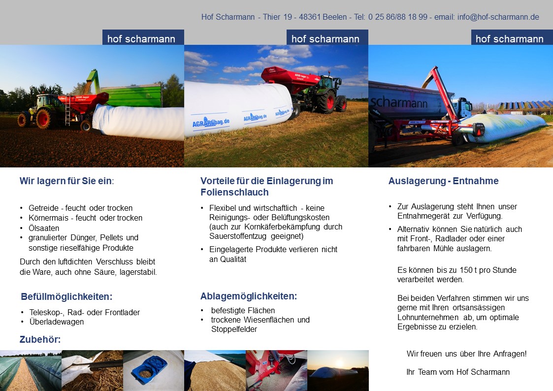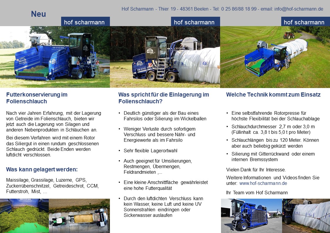 Nach vier Jahren Erfahrung, mit der Lagerung von Getreide im Folienschlauch, bieten wir jetzt auch die Lagerung von Silagen und anderen Nebenprodukten in Schläuchen an.